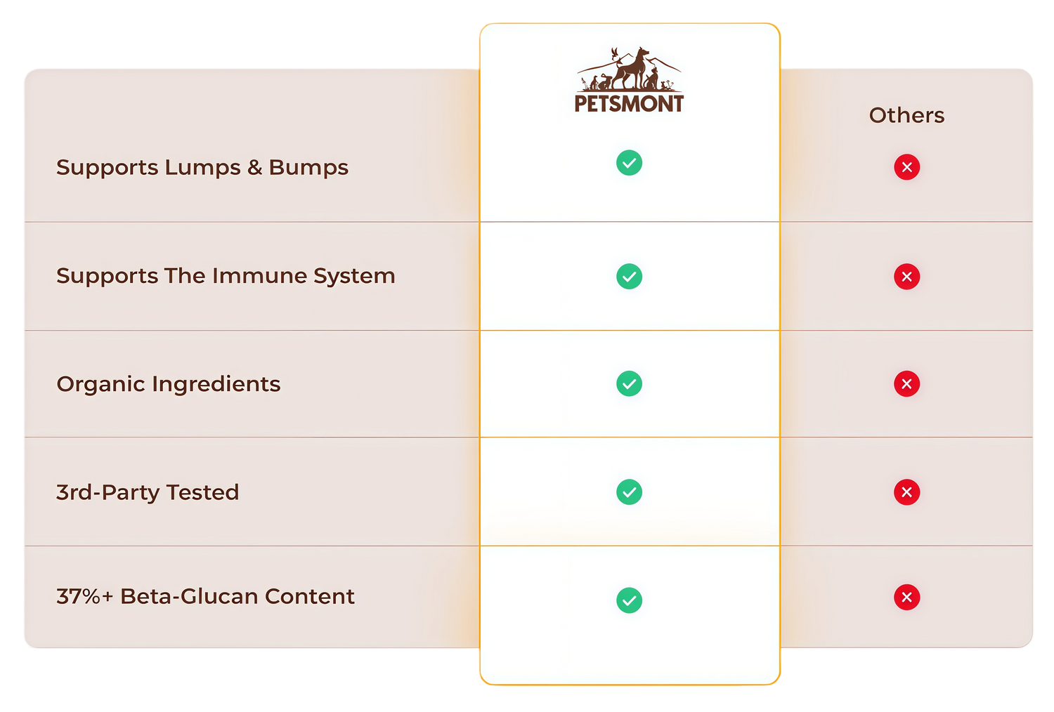 Vet visits only get you so far. Most of the time, vets will just say to "keep an eye on it." Our supplement is rich in beta-glucans that boost dogs' immune systems. When the immune system is stronger, your dog's natural immune system addresses the fatty tissue that makes up lumps and bumps.